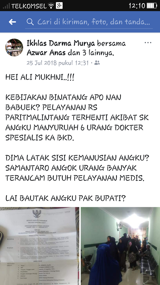 Ditegaskan Monrizal, akun facebook Ikhlas Darma Murya mengunggah status pada 25 Juli 2018 pukul 12.31Wib. Dalam unggahannya itu, akun Ikhlas Darma Murya menuliskan kalimat "Hei Ali Mukhni!! Kebijakan binatang apo nan babuek? Pelayanan RS Paritmalintang terhenti akibat SK angku manyuruah 6 orang dokter spesialis BKD dima latak sisi kemanusian angku? Samantaro angok urang banyak terancam butuh pelayanan medis. Lai bautak angku pak bupati".