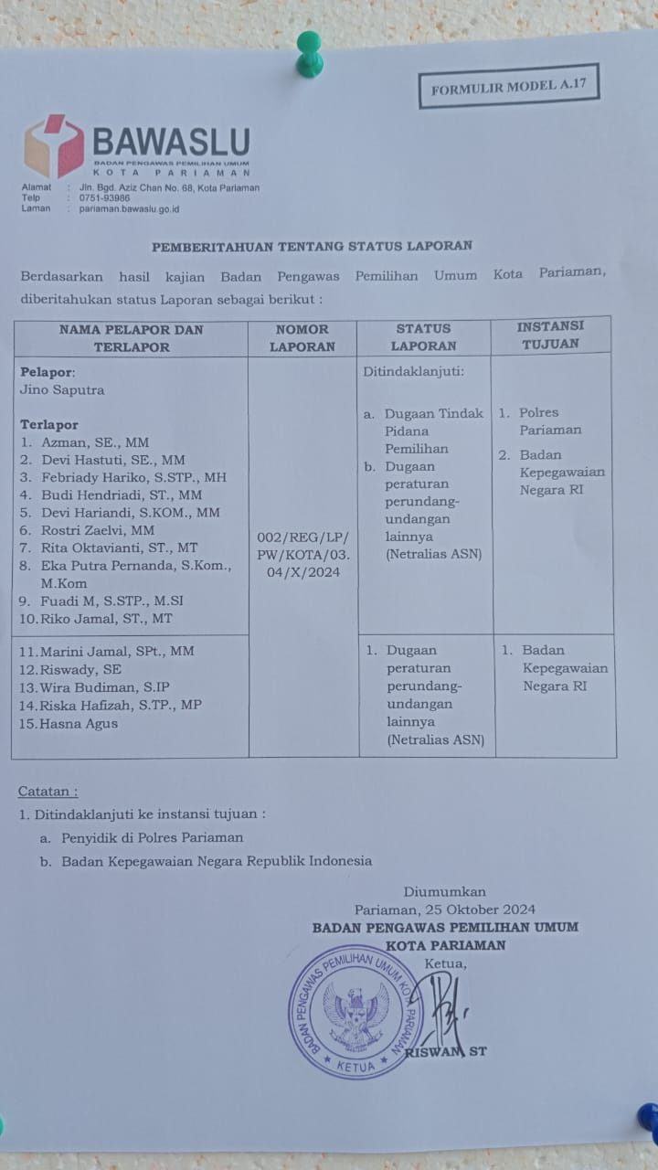 Bawaslu Pariaman sendiri secara resmi telah mengumumkan status kajian atas dugaan pelanggaran pidana pemilu dan netralitas ASN yang melibatkan 15 oknum pejabat eselon II dan III Pemko Pariaman pada Jumat (25/10/2024).
